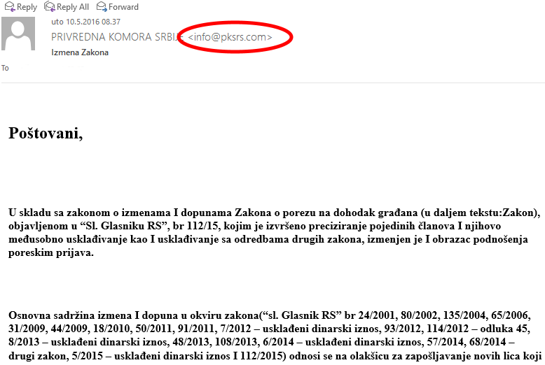 Upozoravamo da je u toku phishing kampanja koja je direktno usmerena na Srbiju! Poruka je na srpskom i u naslovu poruke piše "Izmena zakona".