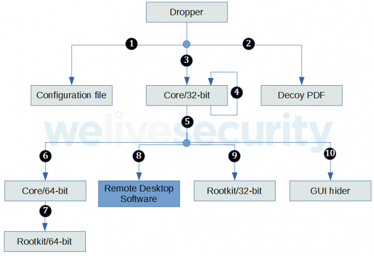 - Dropper prvo otpakuje sve komponente; konfiguracioni fajl, remote desktop softver i core komponentu koja ga instalira, userland rootkit, GUI hider i PDF fajl koji služi kao mamac.