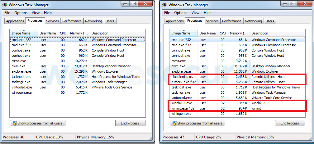 Slika 6. Sa ubačenim userlan rootkit-om, neki procesi nedostaju na listi (levo). Bez rootkit-a, procesi su vidljivi (desno)