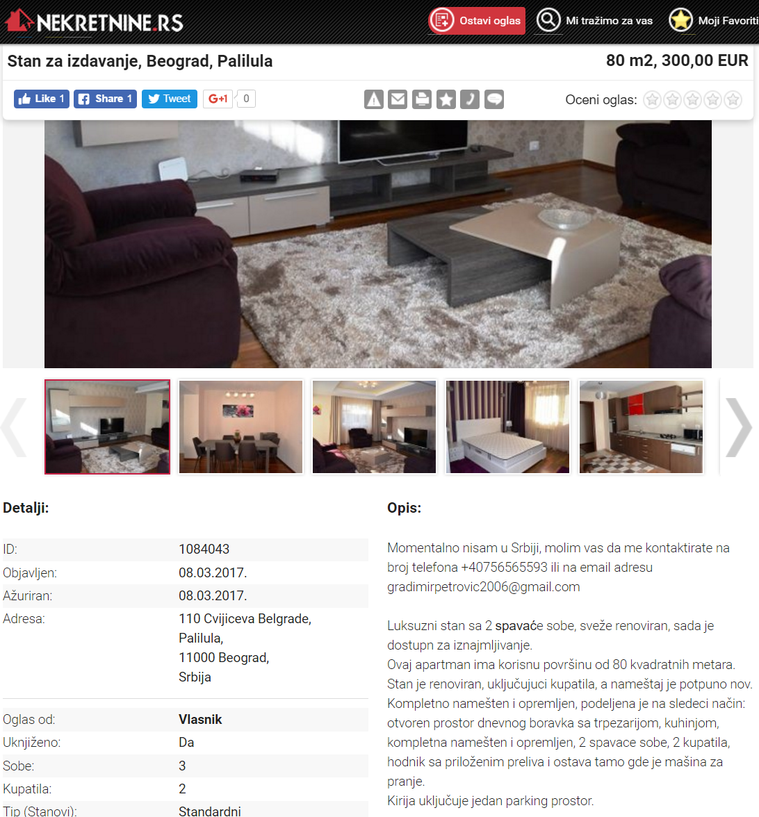 Na prvi pogled, za onog ko prati nekretnine, ovo deluje kao izrazito dobra ponuda. I sam sam se oduševio ovim pronalaskom i dogovorio sa svojom lepšom polovinom da što pre stupim u kontakt sa vlasnikom. I u tom momentu se pali prva signalna lampica u mom analitičkom sistemu - kontakt su broj telefona u inostranstvu i email adresa?