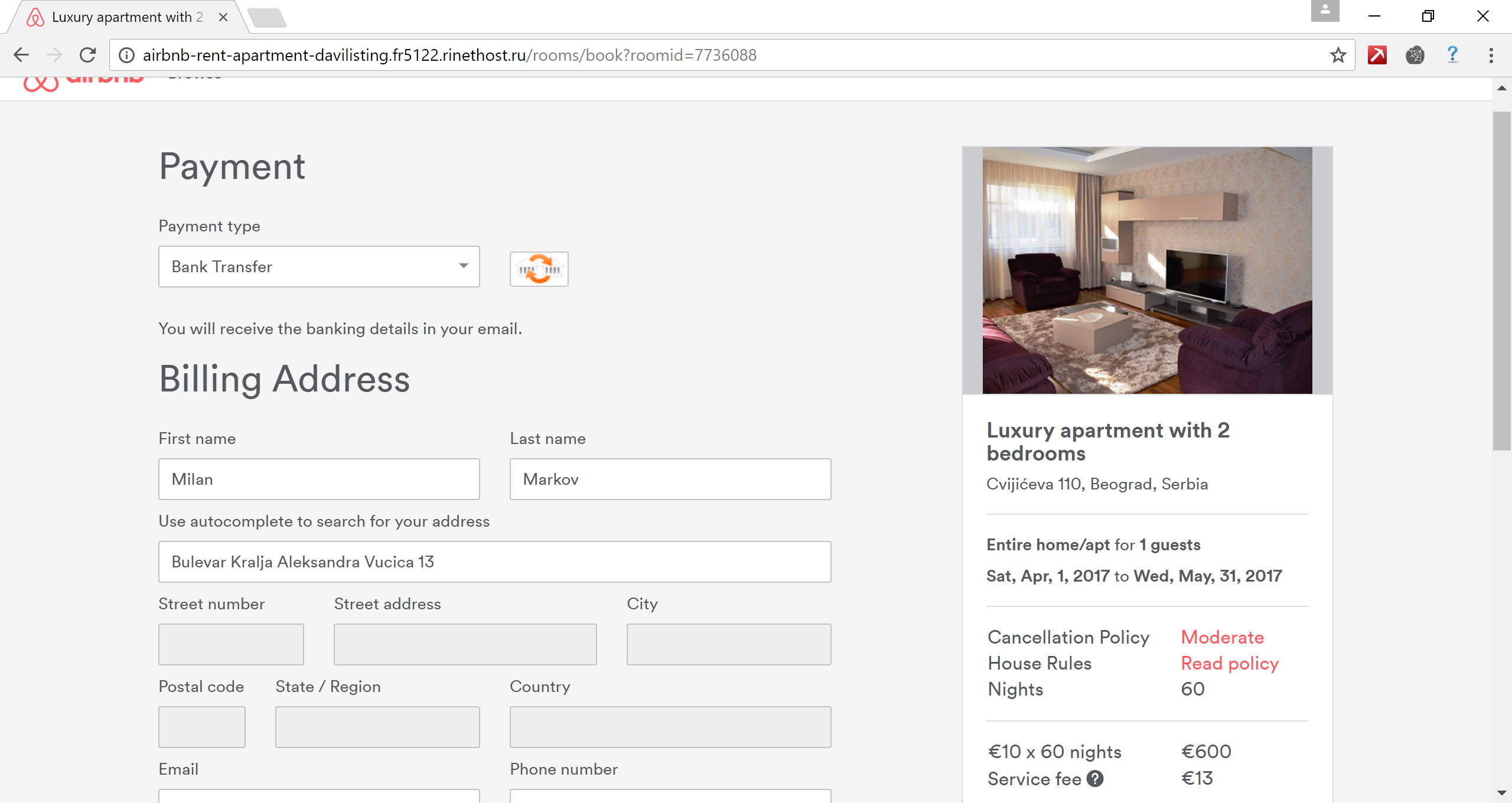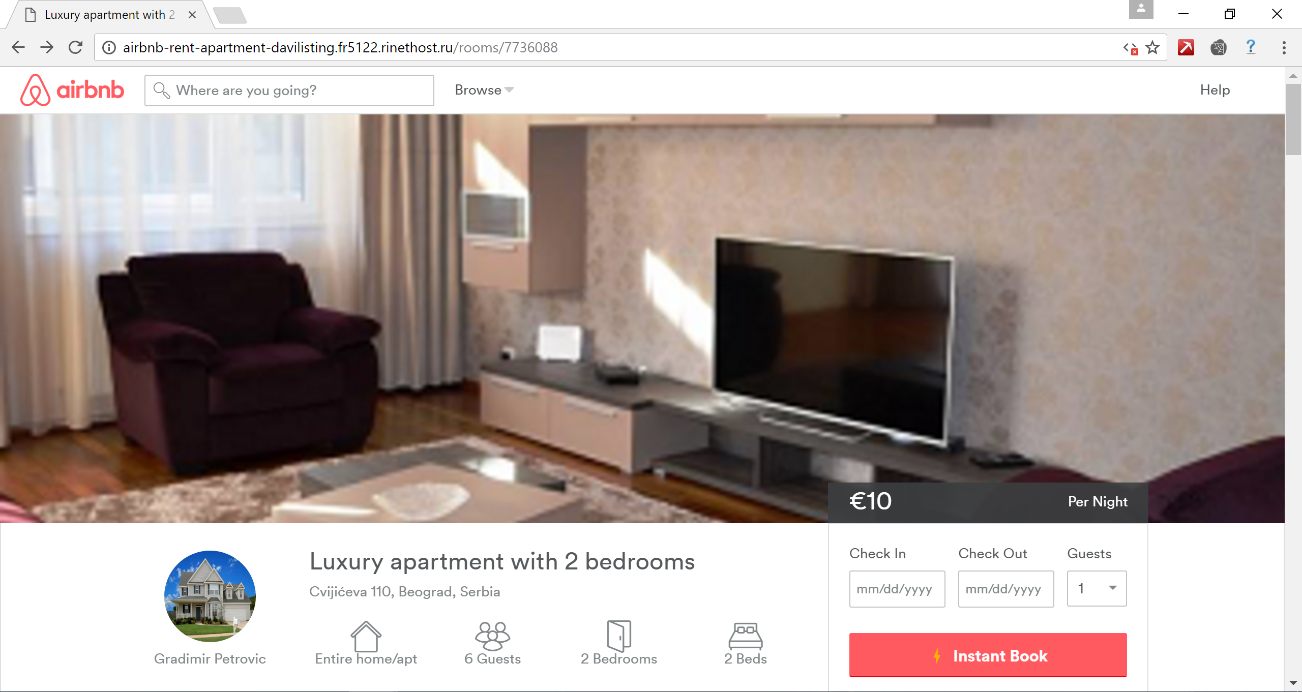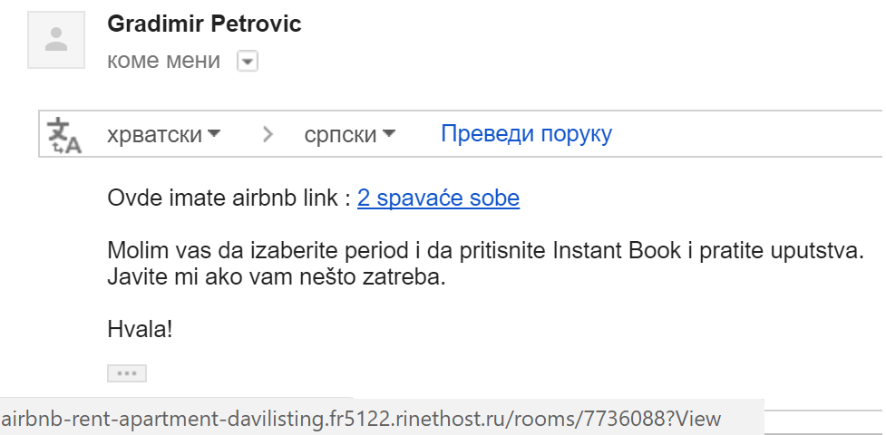 Pohvala drugaru sa druge strane što je barem link u mailu zamaskirao tekstom (mouse over link otkriva destinaciju, prikazano na dnu slike), a bilo bi suviše očigledno da nije. A i samo skidanje airbnb stranice je fino odrađeno, mada svako ko je barem 10ak oglasa pogledao na pravom airbnb sajtu primetio bi da ovde nedostaju mnoge funkcionalnosti.