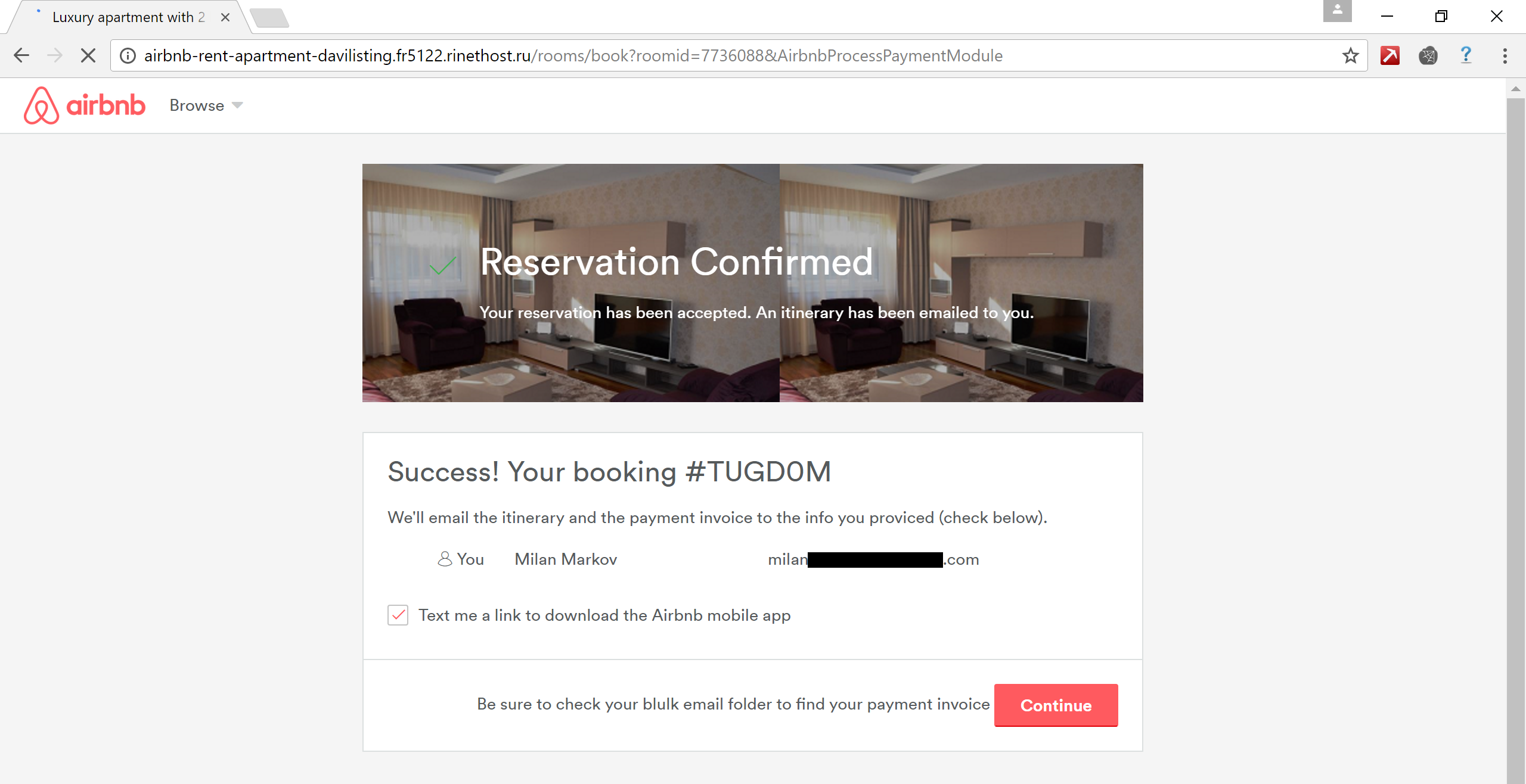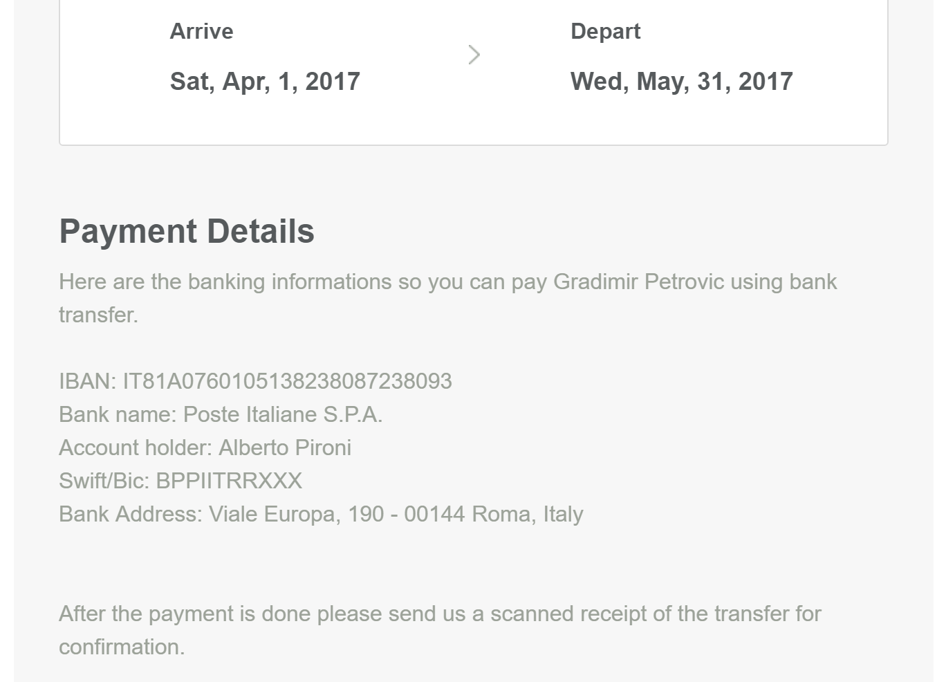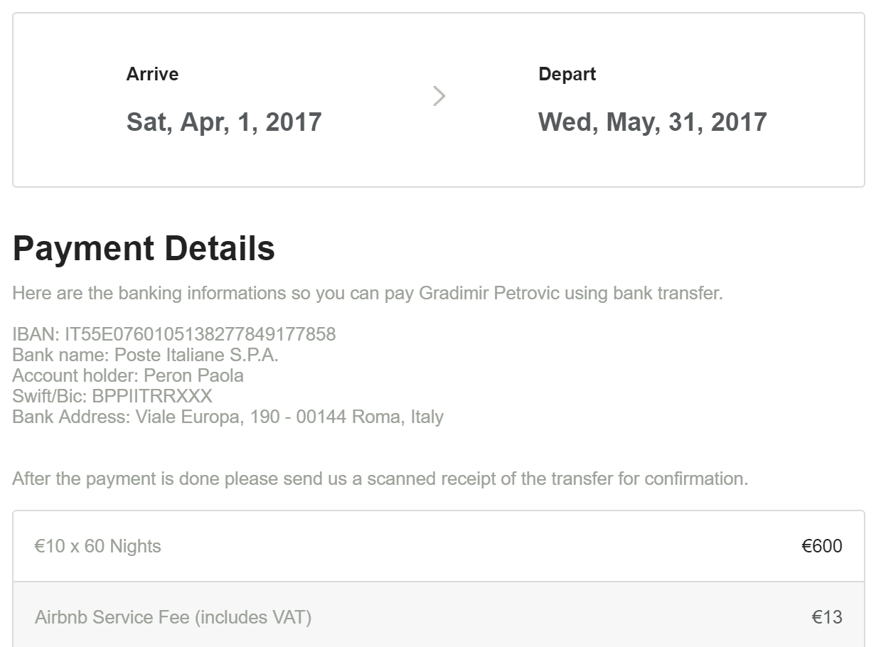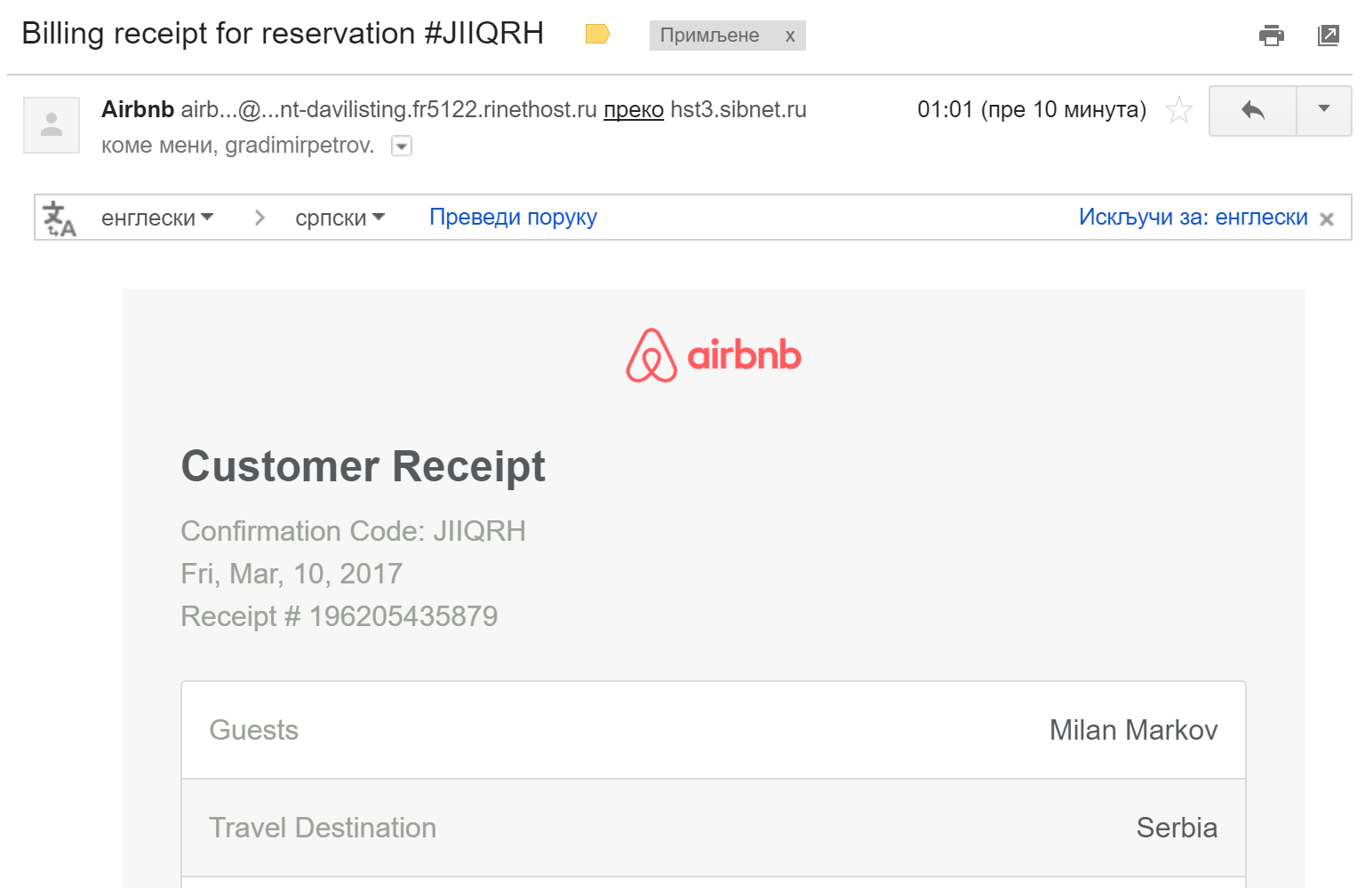 Ubrzo je stigao i mail od "airbnb" sa instrukcijama za uplatu...