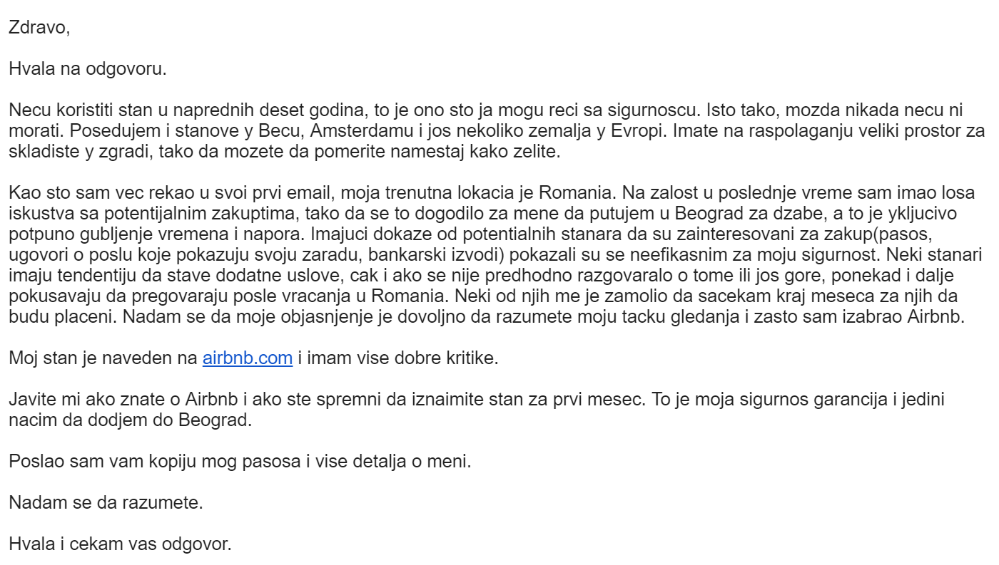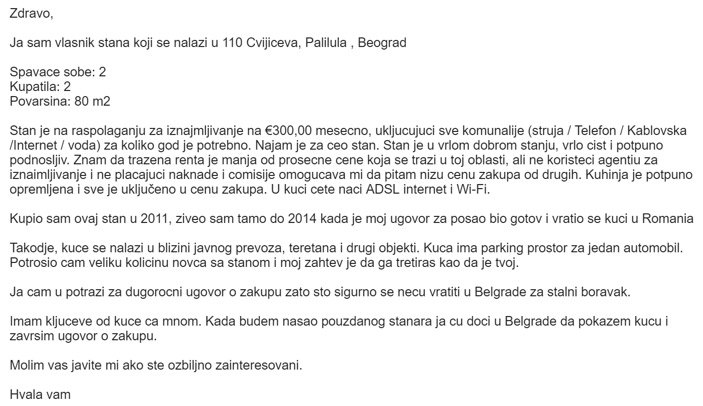 Jaoj bre Gradimire, kude ti se dade srBski jezik? Ah, ok, komšija rumun je u pitanju (poklapa se sa analizom broja telefona)... srpskog porekla pa otuda "Gradimir Petrović"? Već mi tu nešto ne štima ali dobra ponuda (komunalije uključene u cenu?!) me primorava da nadjem neko "logično" objašnjenje - znam, možda je Gradimir samo neki posrednik sa dotičnim rumunom koji izdaje stan?! Odgovaram da sam zainteresovan, naravno, iako se lampice i dalje pale i signaliziraju da nešto nije ok (pa ženi već najavljujem da se ne nada previše dok ona ostaje u čudu). Postavljam i neka dodatna pitanja o stanu i nudim razgovor na engleskom ukoliko je komšiji rumunu to lakše... Stiže i novi mail: