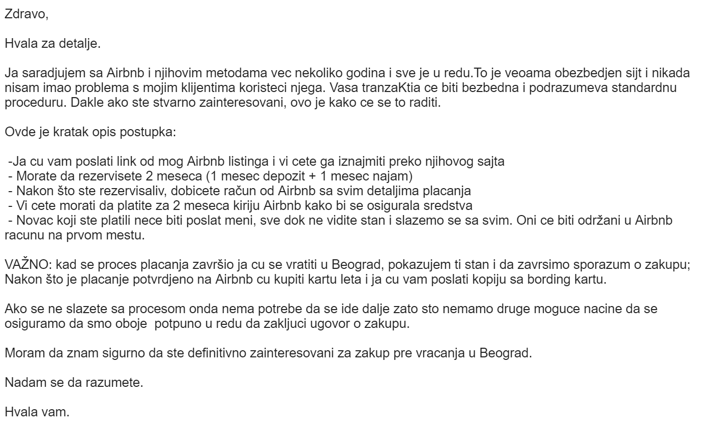 Razočaran, ali iskreno i ushićen jer sam shvatio da sam "omirisao slatkog crvića na toj šiljatoj udici koja je zabačena u moju vodu" nastavljam dalje sa komunikacijom, iz znatiželje da vidim šta je sledeće. Odgovaram da sam i dalje zainteresovan, da znam za airbnb i tražim mu link, uz ponovljeno pitanje na kom se spratu nalazi stan.
