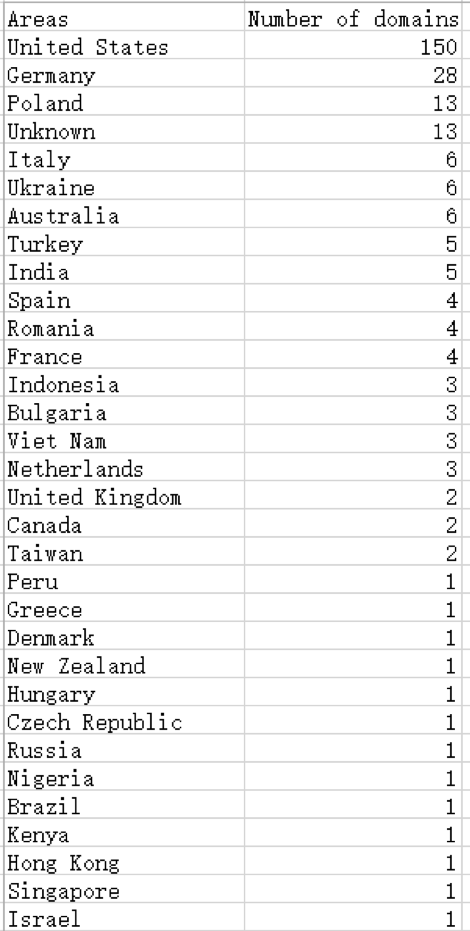 U proseku se jedan domen koristi za 16 različitih phishing URL-ova. Geografski posmatrano, ubedljivo najviše phishing domena je hostovano u SAD-u (150), zatim u Nemačkoj (28) i Poljskoj (13).