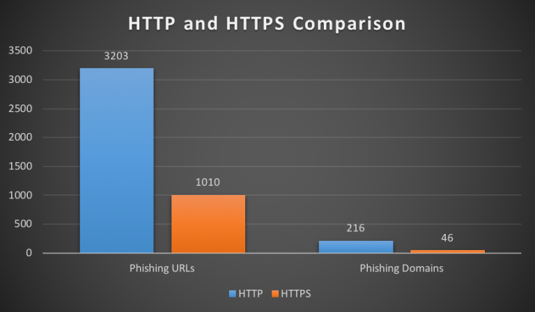 HTTPS phishing URL-ove je malo teže identifikovati. Od pomenutih 4.213 phishing URL-ova, 1.010 su HTTPS i dolaze sa 46 jedinstvenih domena. U proseku se jedan domen koristi za 21 različiti phishing URL.