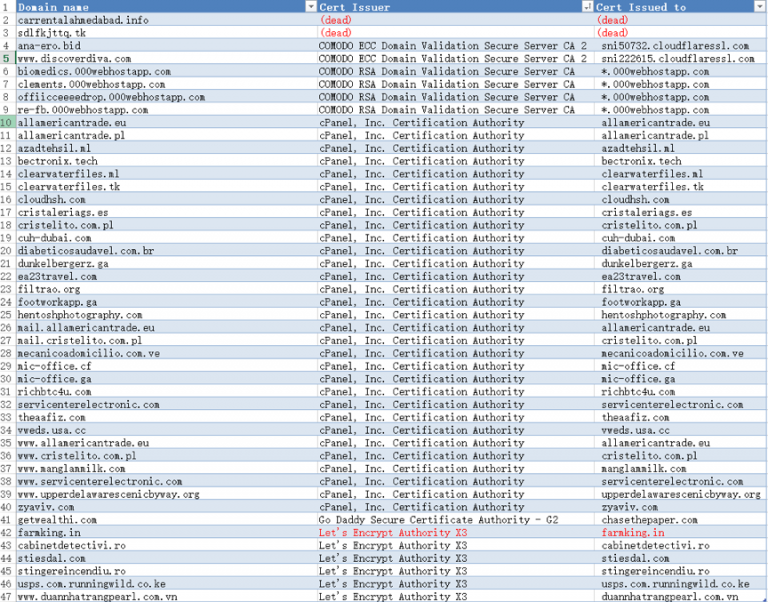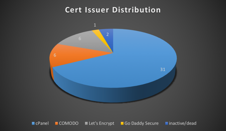 SSL sertifikate za tih 46 phishing domena izdali su “cPanel“ (31), “Comodo“ (6), “Let’s Encrypt“ (6), “Go Daddy Secure“ (1), a 2 domena više nisu aktivna.